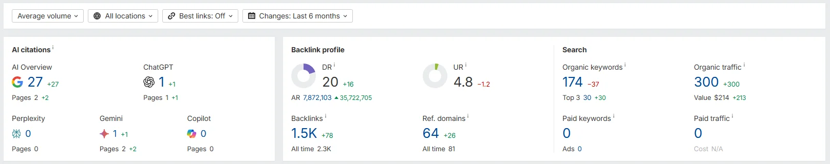 • ChatGPT: 1 citation (+1), on 1 page (+1) — 🤝 Emerging visibility in conversational AI platforms, marking early-stage influence.